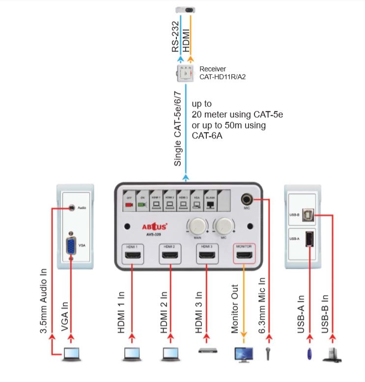 1 × PC-Audio (*3.5mm) 1 × Mic Input (*6.3mm) 1 × USB-B   1 × USB-A  3 × HDMI Input (19 pin female with build in buffer) Output: 1 × CAT5e/6/7 output (To RX) 1 × HDMI monitor output