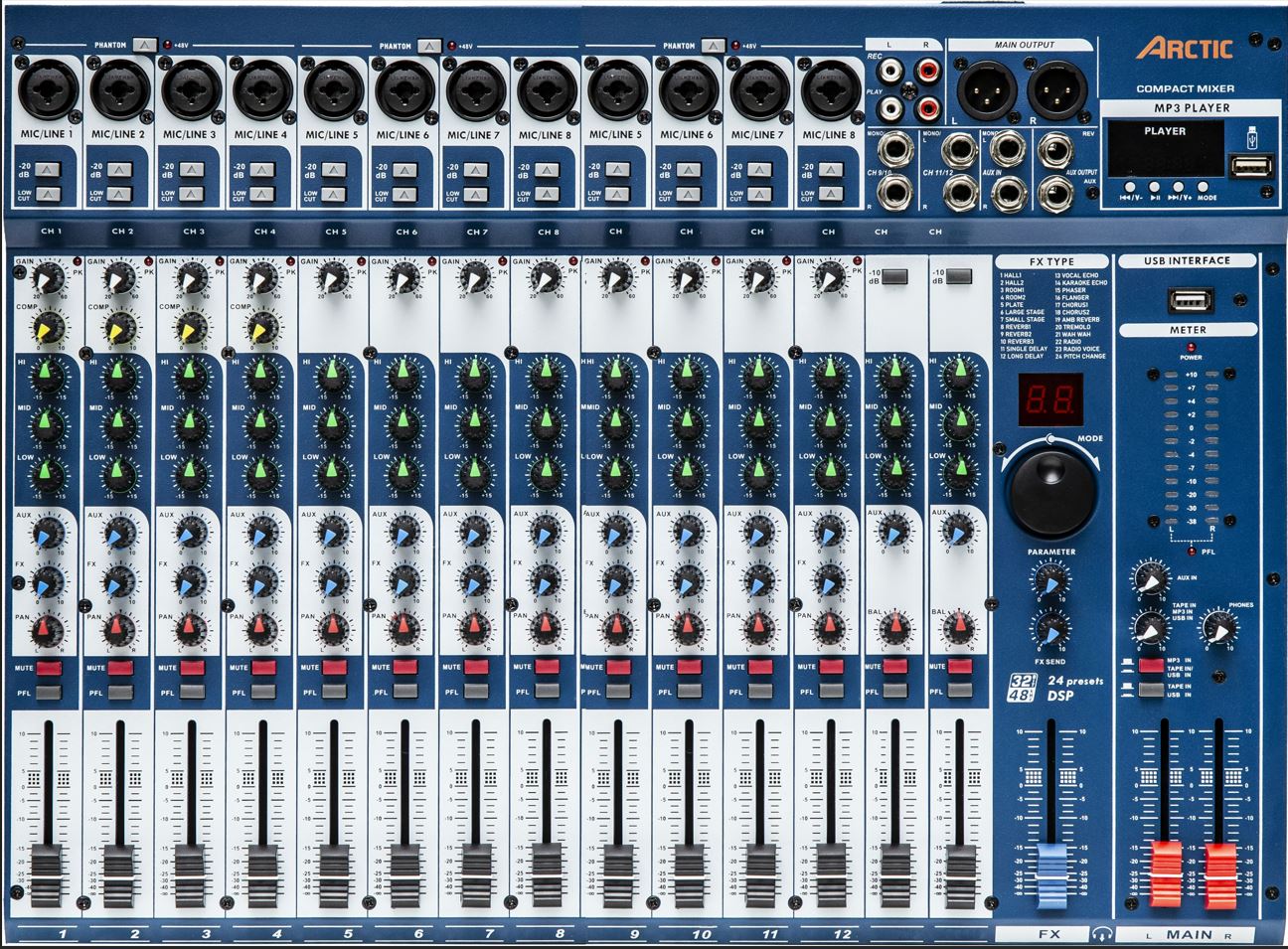 16 Channel Audio mixer with high quality effects, USB in and out for recording and playback, 12 mono inputs and 2 stereo inputs.