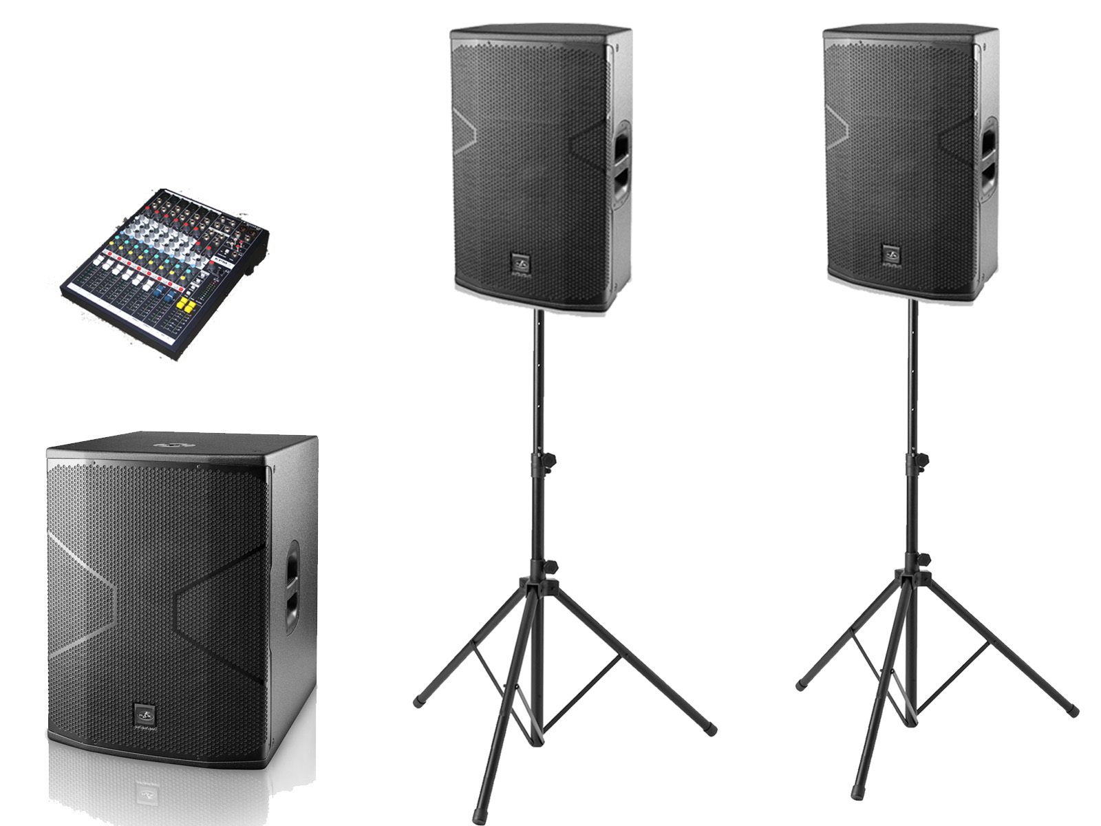 This popular hire sound system sounds fantastic and has plenty of power. It comes with one subwoofer and the two mid-high single 12" speakers, a pair of speaker stands and all the cables you need to connect it together.