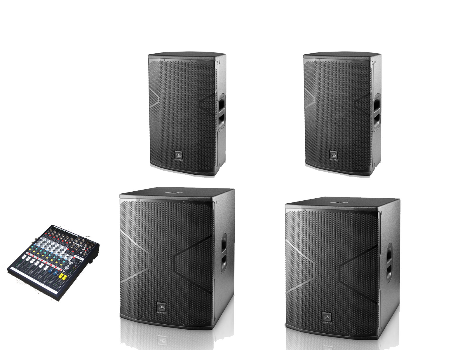 This popular hire sound system sounds fantastic and has plenty of power. It comes with the two subwoofers and the two mid-high single 12" speakers and all the cables you need to connect it together and start the party.
