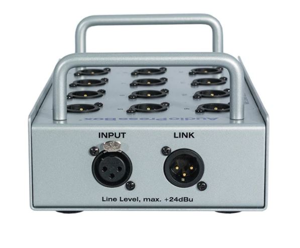 A professional portable passive press box (Audio Splitter) suitable for both indoor and outdoor press conferences. It features 1 Line Input and 12 MIC outputs. Each Output is independet transformer balanced and isolated. It also has a link Output so you can daisy chain more of them in a row if you need additional MIC Outputs.