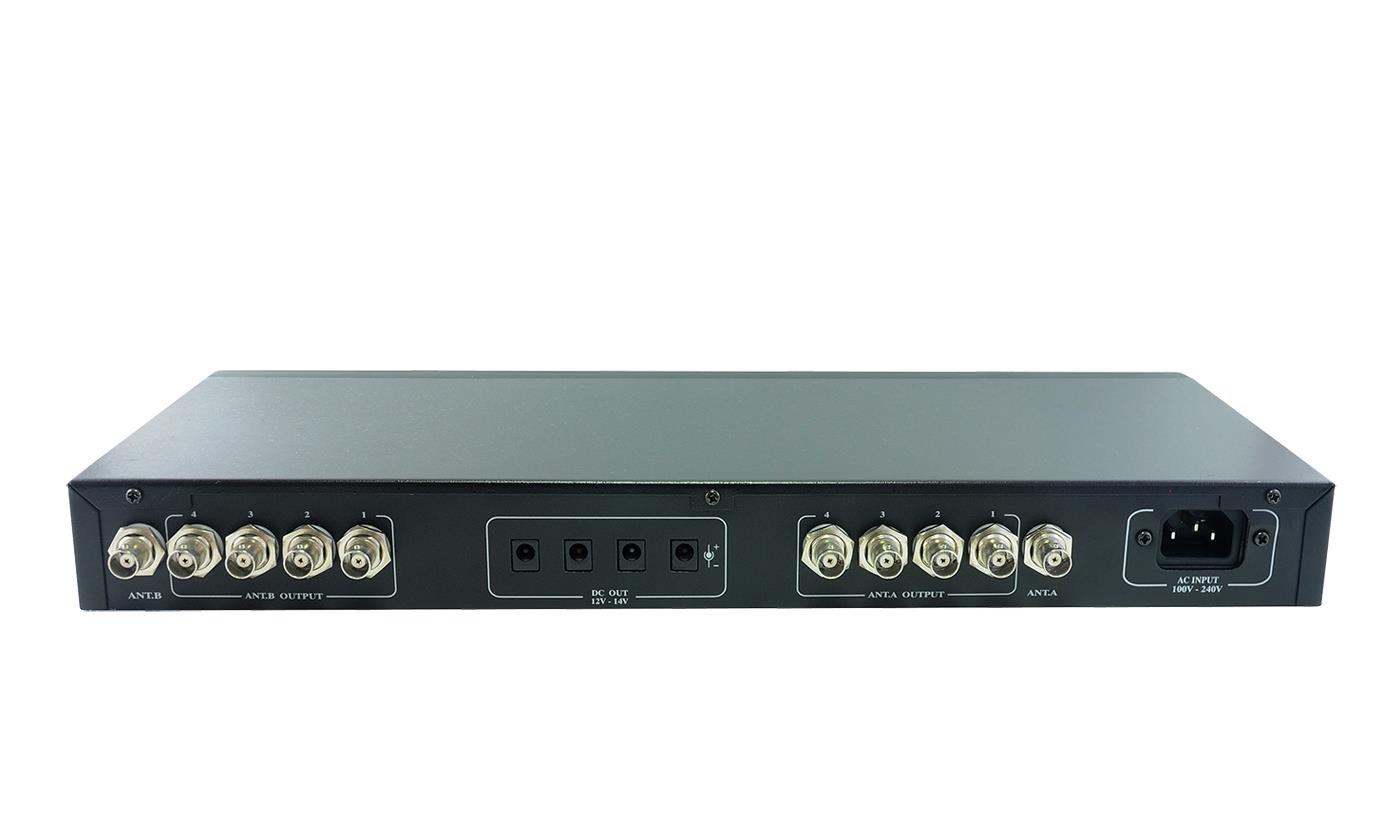 Powered Wideband Antenna Divider - rack mount UHF antenna splitter for 4 diversity wireless microphone receivers - provides BNC antenna splitting and 12V DC jacks for powering the receivers.