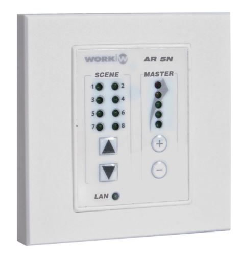 AR 5N is a wall-mount controller that allows control over a LightMouse device ( LM 5 ) on a common LAN and control two basic parameters such as SHOWs selection previously recorded in the LM 5 and general dimmer.
